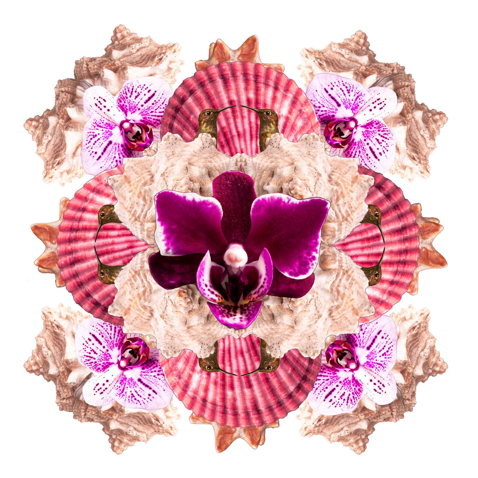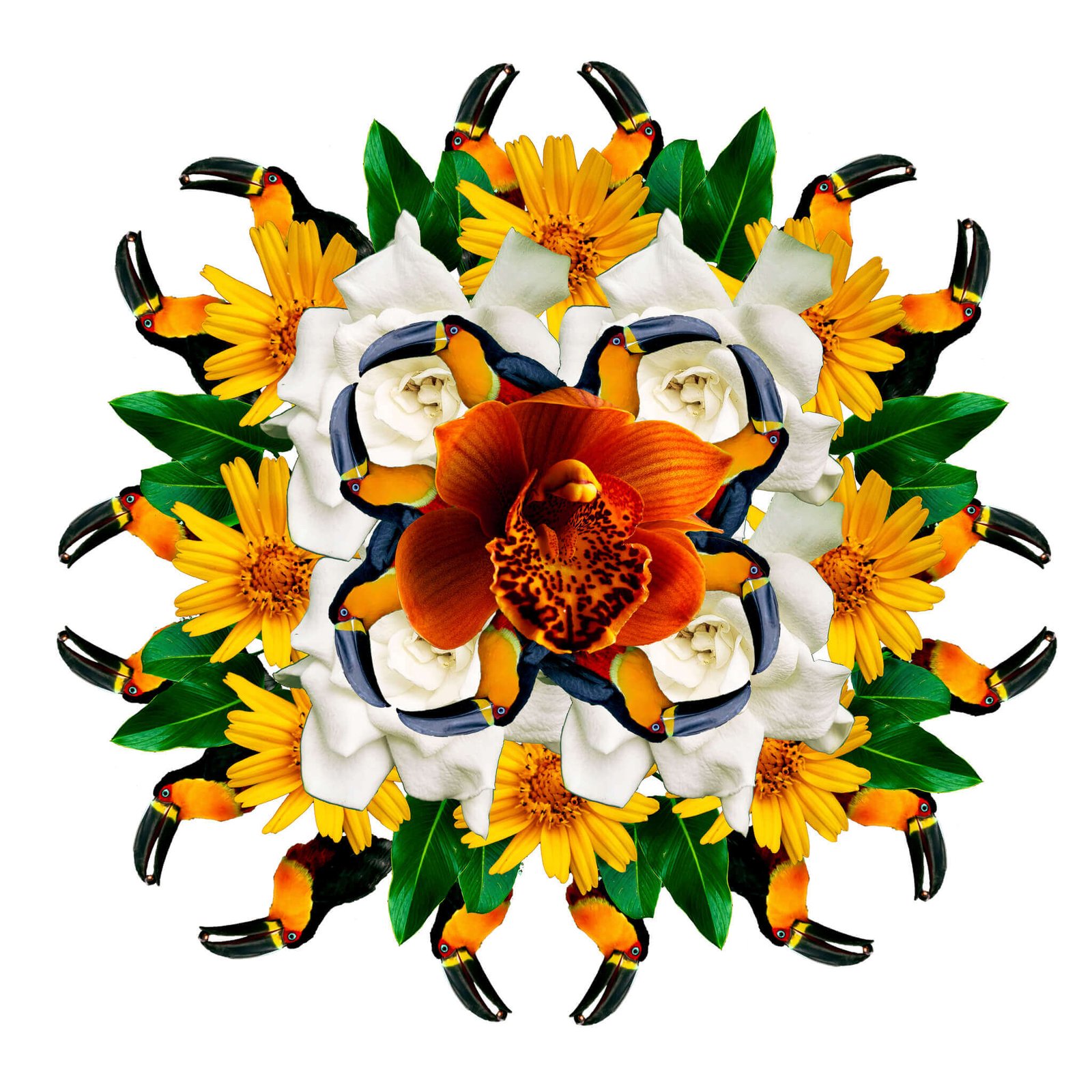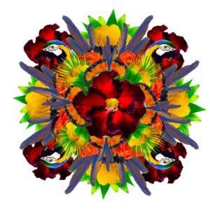 Colagens digitais feitas inteiramente a partir de fotografias autorais. A arara, as flores, as plantas, o cocar Pataxó, são recortes de registros fotográficos feitos ao longo de cinco anos. Em uma estética e poética fractal, a imagem ganha forma e cores em uma mandala.